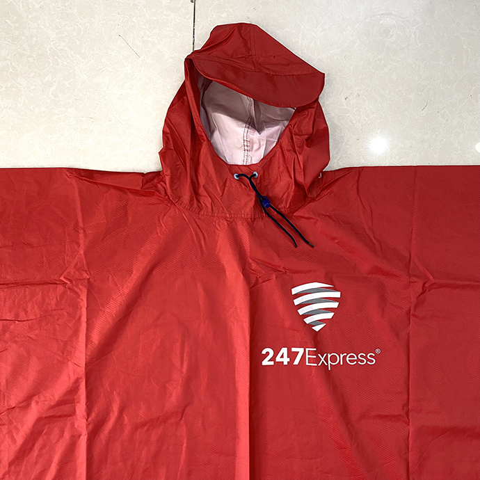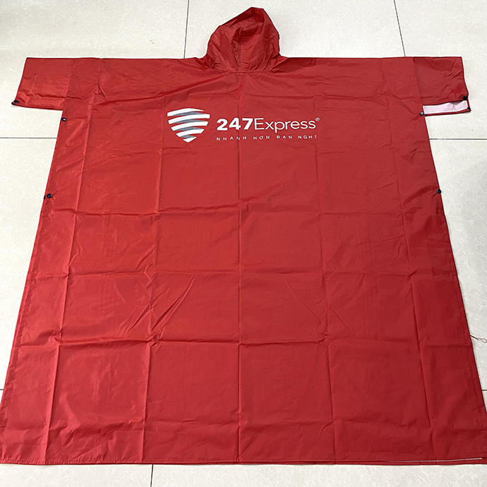 Áo mưa doanh nghiệp màu đỏ in logo 247 Express là mẫu áo mưa quảng cáo cao cấp, được thiết kế chuyên biệt cho doanh nghiệp vận chuyển, logistic và thương mại điện tử. Sản phẩm làm từ vải dù chống thấm bền bỉ, nhẹ, dễ gấp gọn và có thể in logo theo yêu cầu giúp tăng độ nhận diện thương hiệu trong mọi điều kiện thời tiết.