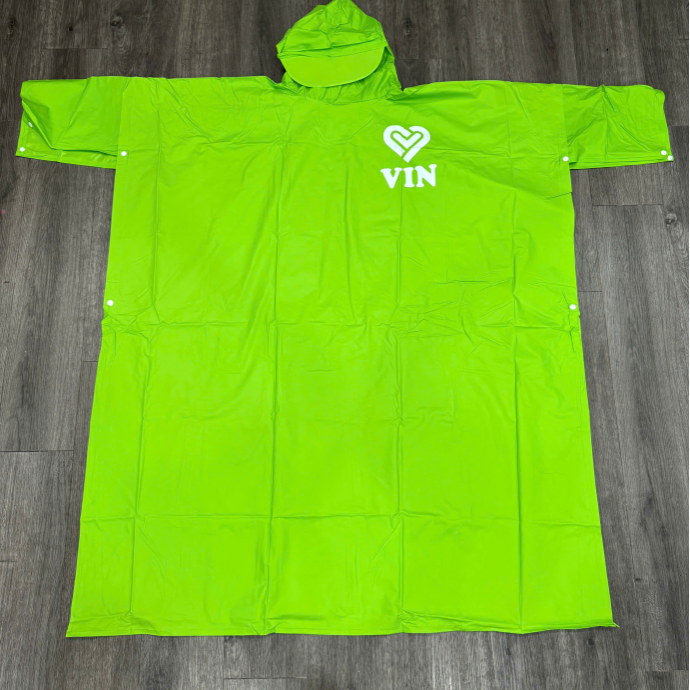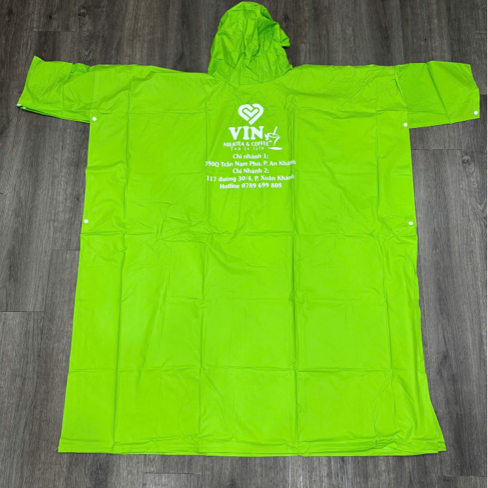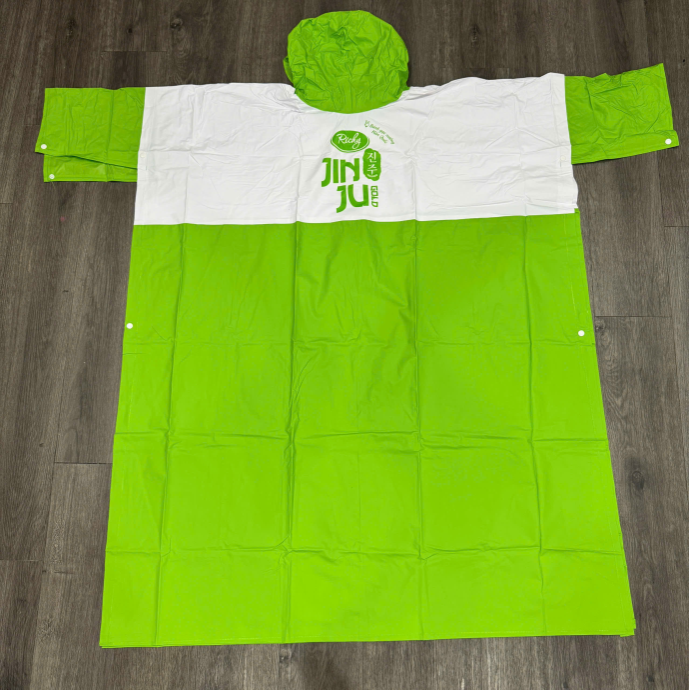 Áo mưa sự kiện in logo JINJU – thiết kế nửa thân phối màu xanh lá tươi sáng, nổi bật, phù hợp cho các hoạt động quảng bá thương hiệu ngoài trời.