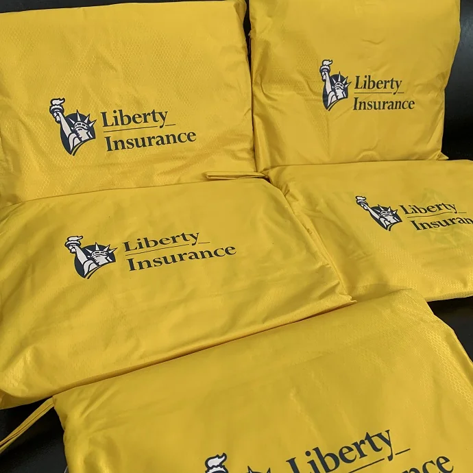 Áo mưa cánh dơi in logo Liberty Insurance màu vàng được nhiều doanh nghiệp lựa chọn nhờ màu sắc nổi bật, diện tích in logo lớn và khả năng tiếp cận thương hiệu cao trong môi trường sử dụng thực tế. Đây là sản phẩm quà tặng phù hợp cho các chiến dịch marketing mùa mưa.
