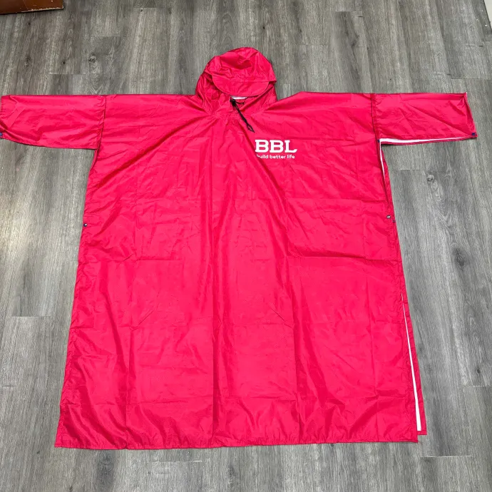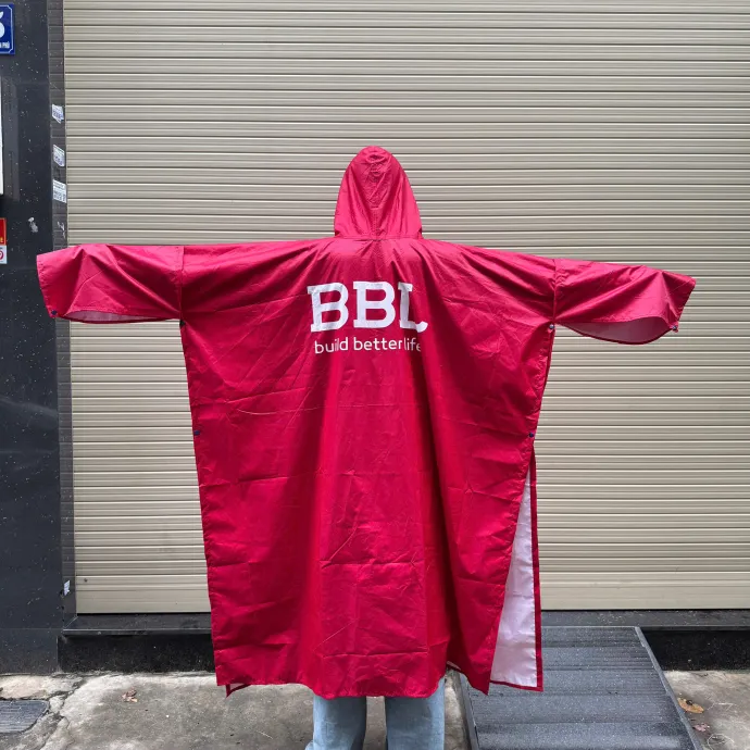 Áo mưa trùm người, có mũ che chắn, màu đỏ và xanh navy nổi bật. In logo BBL build better life sắc nét, vừa tiện dụng vừa mang lại giá trị quảng bá thương hiệu.