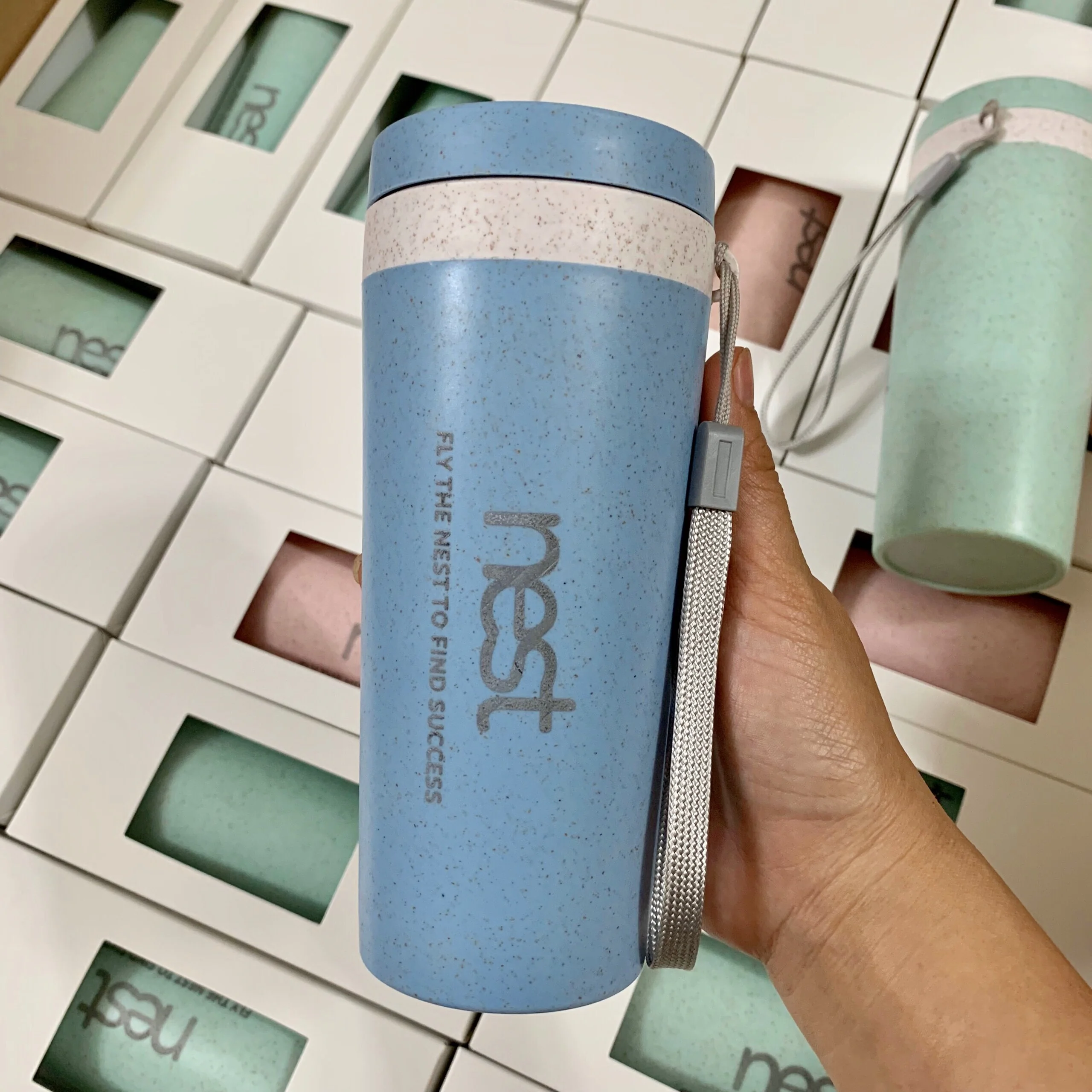 Bình nước lúa mạch màu hồng thiết kế nhỏ gọn, nắp xoáy chắc chắn và dây đeo tiện lợi, phù hợp làm quà tặng sự kiện, học sinh – sinh viên và doanh nghiệp.
