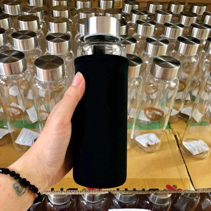 Bình đựng nước thủy tinh borosilicate dung tích 420ml, thiết kế dáng trụ thanh lịch, chịu nhiệt tốt. Sản phẩm có thể bọc đen cách nhiệt hoặc may túi vải theo yêu cầu, phù hợp làm quà tặng in logo cho cơ quan, tổ chức.