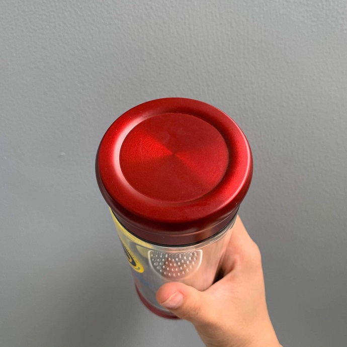 Bình được làm từ thủy tinh chịu lực, trong suốt, dễ vệ sinh và hoàn toàn không gây mùi. Nắp inox chắc chắn giúp hạn chế rò rỉ nước khi di chuyển.