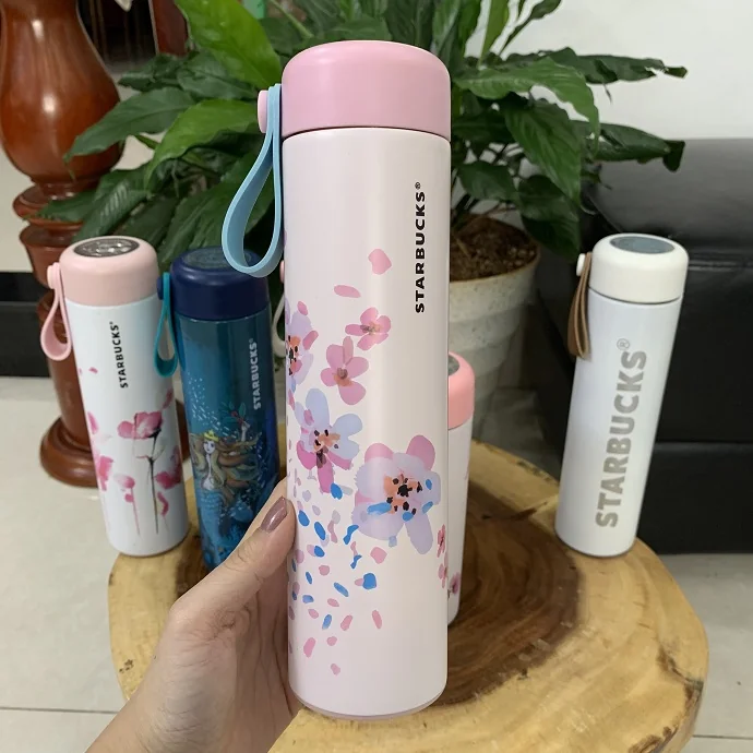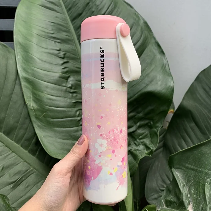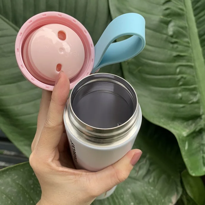 Bình được in họa tiết hoa, họa tiết nghệ thuật và tông màu pastel như hồng, trắng, xanh tạo cảm giác dễ thương và thanh lịch. Dây xách silicone mềm giúp cầm nắm thuận tiện và an toàn khi di chuyển.