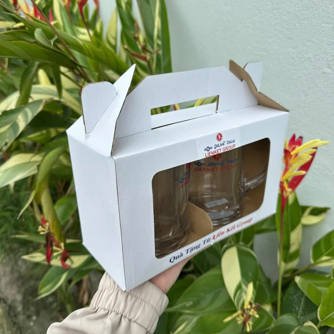 Bộ 2 ly thủy tinh quai cầm trong hộp giấy – thiết kế tinh tế, chắc chắn, phù hợp làm quà tặng tri ân khách hàng, đối tác trong sự kiện, hội nghị.