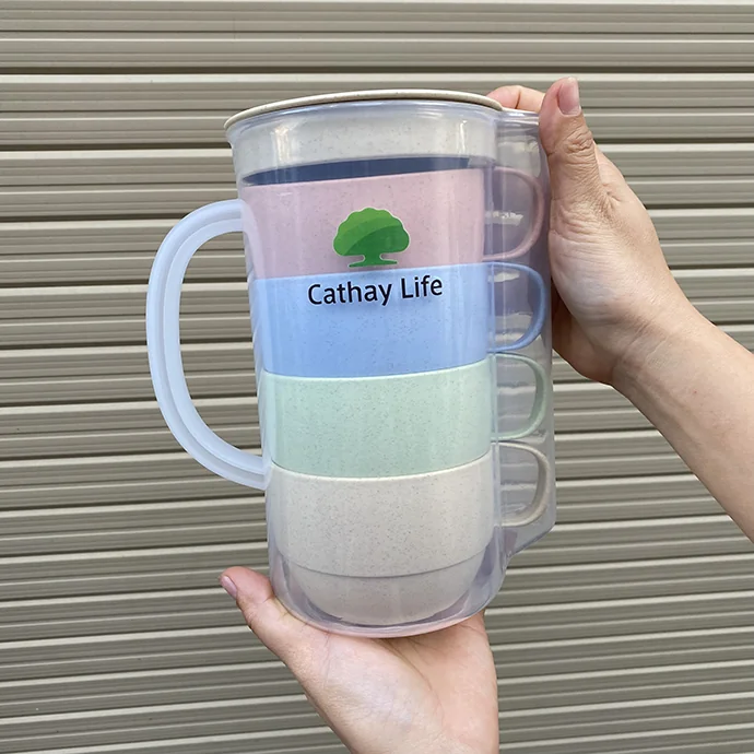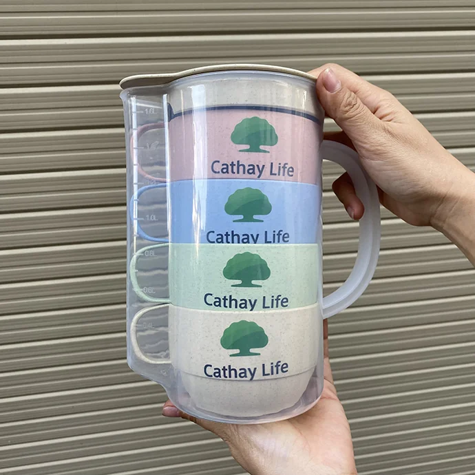 Bộ bình nước nhựa dung tích 1350ml đi kèm 4 cốc nhựa lúa mạch thiết kế gọn gàng, phù hợp sử dụng trong văn phòng, phòng họp hoặc làm quà tặng doanh nghiệp. Chất liệu nhựa PP chính phẩm an toàn cho sức khỏe, không ám mùi khi sử dụng. Bề mặt bình và cốc có thể in logo thương hiệu giúp tăng độ nhận diện trong các chương trình quà tặng khách hàng.