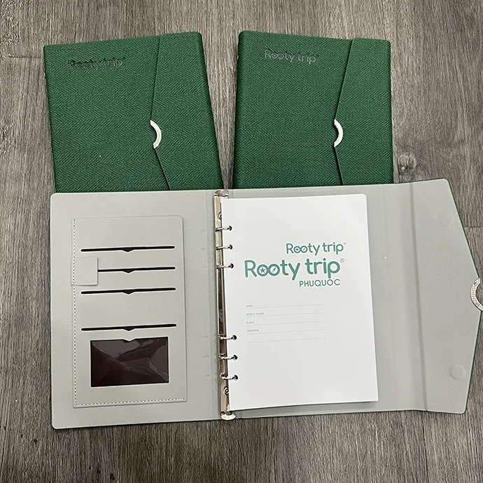 - Bộ sổ gồm: hộp giấy có mút, sổ tay, bút, móc khoá tất cả đèu khắc logo Rootytrip