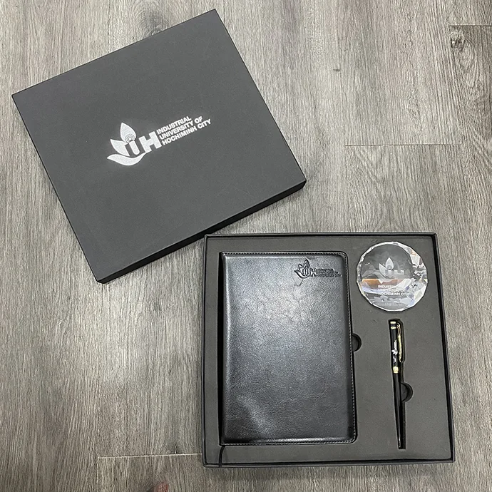 Bộ gift gồm sổ bìa da, kỷ niệm chương pha lê và bút kim loại là set quà tặng trang trọng, phù hợp cho trường học, cơ quan và doanh nghiệp trong các dịp vinh danh – tri ân – hội nghị. Sản phẩm hỗ trợ in logo theo yêu cầu (ví dụ: logo Đại học Công Nghiệp) giúp đồng bộ nhận diện và nâng tầm hình ảnh đơn vị.