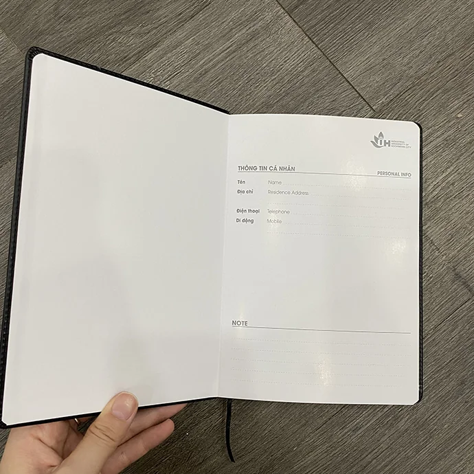 Sổ bìa da mang phong cách lịch sự, phù hợp ghi chép trong các buổi họp, hội thảo, công tác. Bề mặt bìa hỗ trợ in/dập logo giúp tăng độ chuyên nghiệp và tính nhận diện.