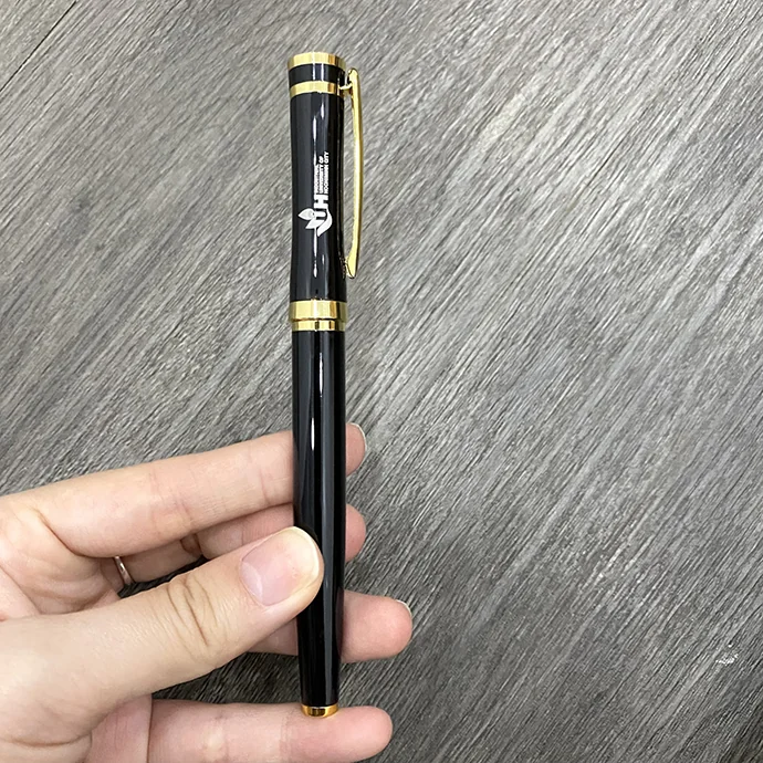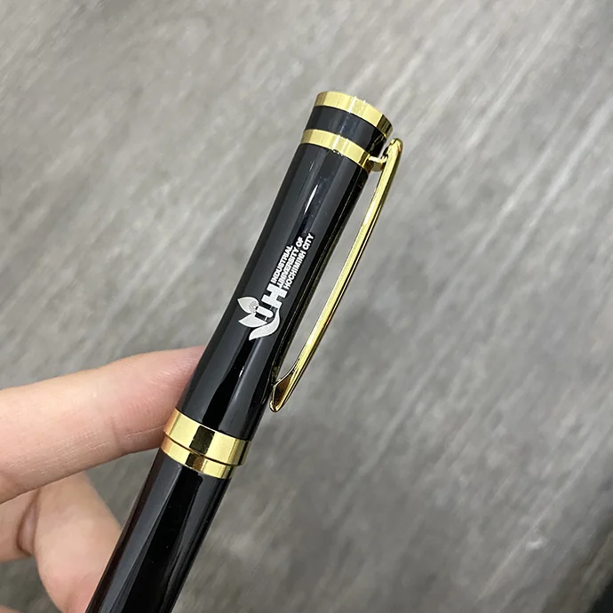 Bút kim loại kiểu dáng thanh lịch, phù hợp sử dụng văn phòng. Có thể in hoặc khắc logo để đồng bộ với sổ và pha lê trong set quà.