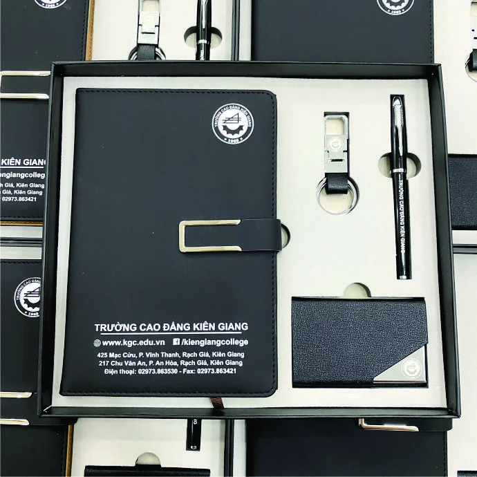 Bộ quà tặng sổ da 4 món gồm sổ da, bút ký, USB/thẻ nhớ và ví card – tất cả được đặt trong hộp cao cấp, sang trọng. Đây là lựa chọn hoàn hảo cho quà tặng trường học, doanh nghiệp, hội thảo, sự kiện và tri ân khách hàng. Logo được in sắc nét theo yêu cầu, thể hiện sự chuyên nghiệp và đồng bộ thương hiệu.