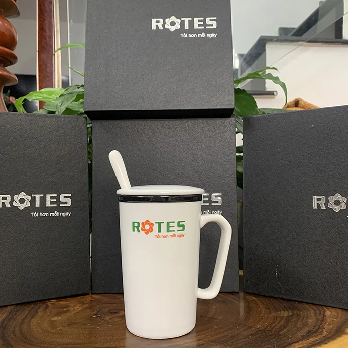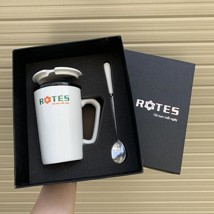 Set quà ly sứ in logo theo yêu cầu là lựa chọn quà tặng tinh tế, phù hợp cho doanh nghiệp, đối tác và khách hàng. Bộ sản phẩm gồm ly sứ có nắp và muỗng đi kèm, được đóng hộp sang trọng, logo in rõ nét giúp nâng tầm hình ảnh thương hiệu.