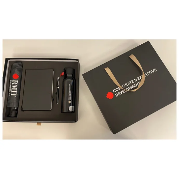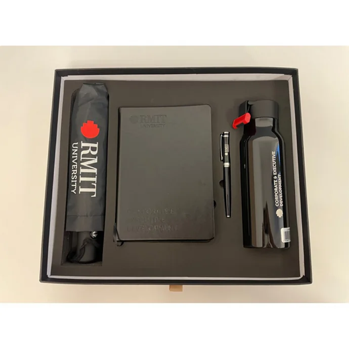 Thành phần bộ quà tặng: Bình giữ nhiệt cao cấp, dù gấp gọn, bút ký tinh tế, sổ tay da sang trọng.