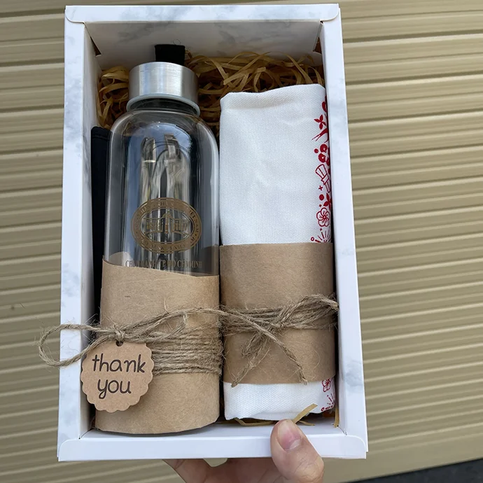 - Bộ quà tặng gồm: bình thuỷ tinh in logo, túi canvas in logo.