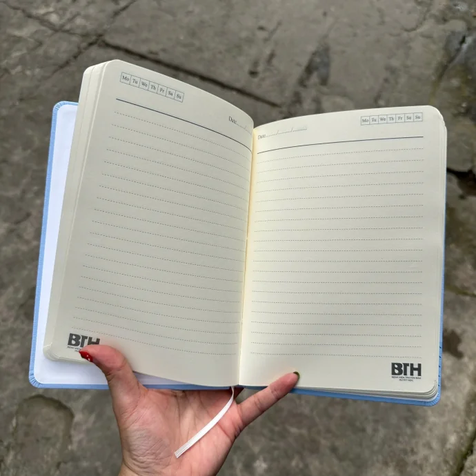 - Ruột sổ: Giấy trắng hoặc kem, dòng kẻ mờ, 100–120 trang