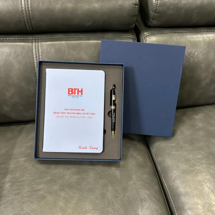 Bộ quà tặng sổ da và bút bi in logo là lựa chọn phổ biến trong các dịp hội nghị, đại hội, chương trình sự kiện, với thiết kế sang trọng và thông điệp được cá nhân hóa. Sản phẩm không chỉ mang tính ứng dụng cao mà còn giúp doanh nghiệp ghi dấu ấn trong lòng người nhận.