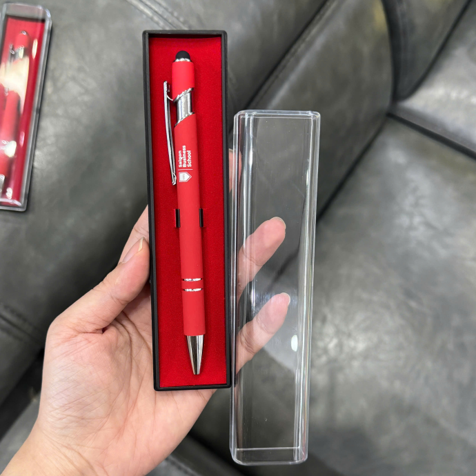 Bút kim loại có thiết kế tinh xảo, thân bút chắc chắn, mực trơn đều, được đựng trong hộp sang trọng (hộp giấy cao cấp, hộp da hoặc hộp nhung). Có thể in hoặc khắc laser logo thương hiệu lên thân bút và hộp, giúp nâng tầm hình ảnh doanh nghiệp.