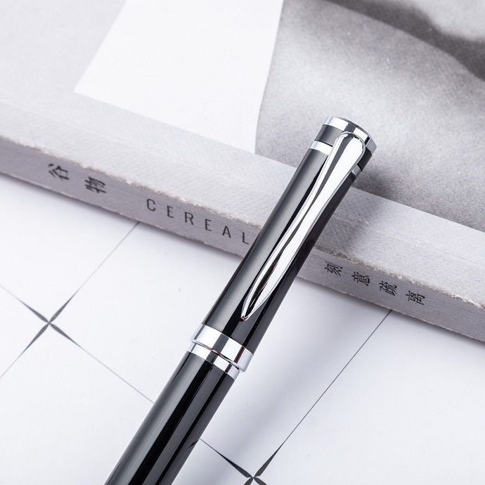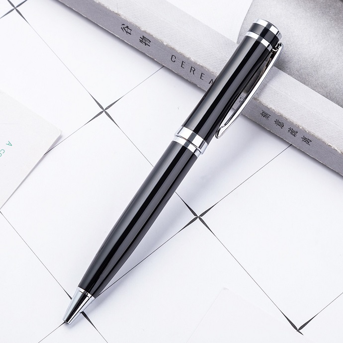 Bút bi kim loại màu đen có thiết kế trang nhã, tinh tế toàn thân đen, cài bạc, tạo nên sự sang trọng và đẳng cấp.