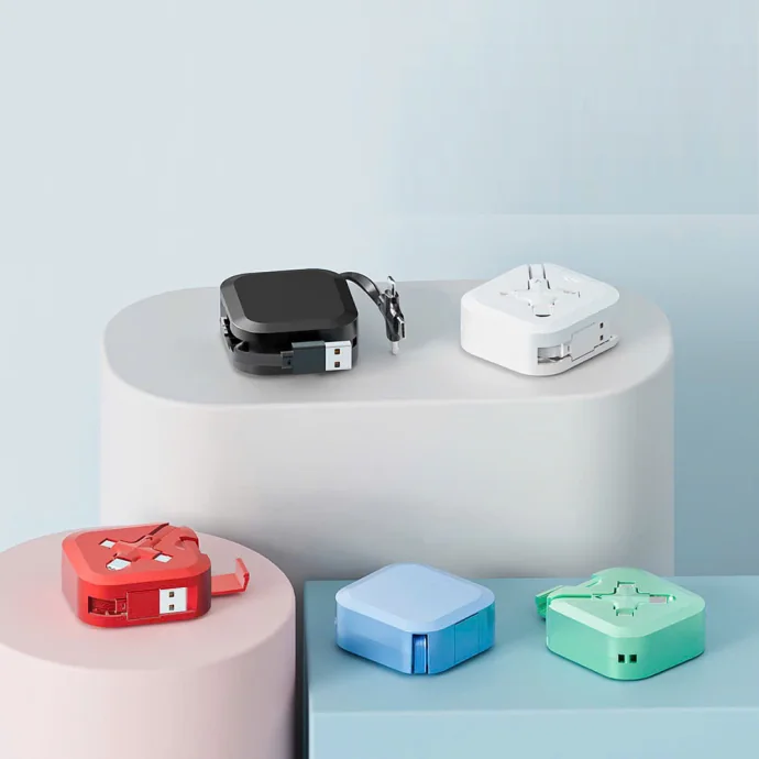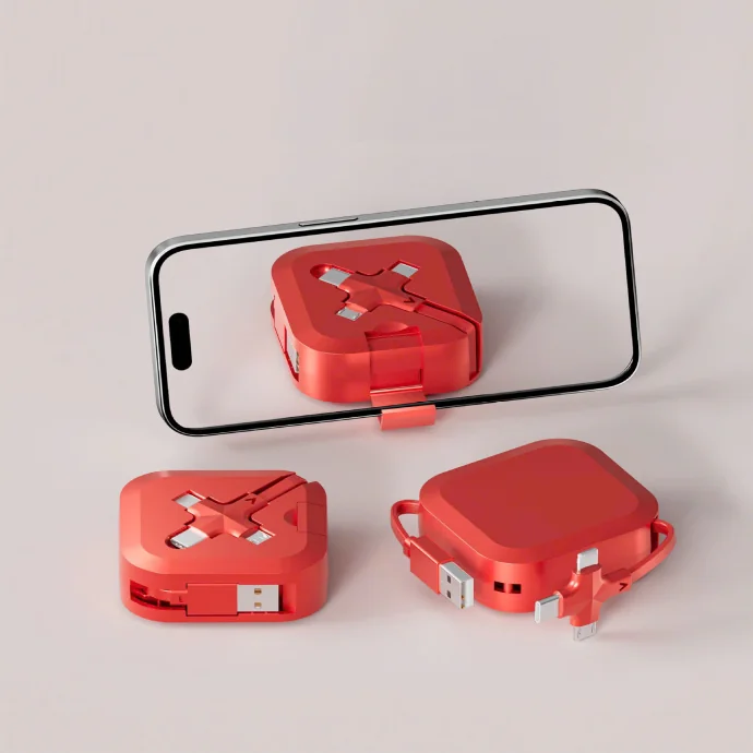 Cáp sạc 3 trong 1 tích hợp giá đỡ điện thoại là giải pháp công nghệ tiện ích dành cho người bận rộn. Thiết kế nhỏ gọn hình vuông, màu đỏ nổi bật, vừa dùng để sạc nhiều thiết bị vừa có thể làm giá đỡ xem video, họp online cực kỳ tiện lợi.