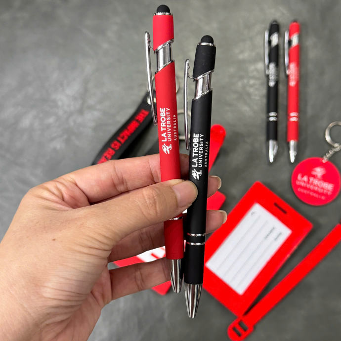 Bút bi cao cấp: Thân bút bằng kim loại hoặc nhựa cao cấp, mực trơn, viết êm. Logo có thể khắc laser hoặc in UV trên thân bút.
