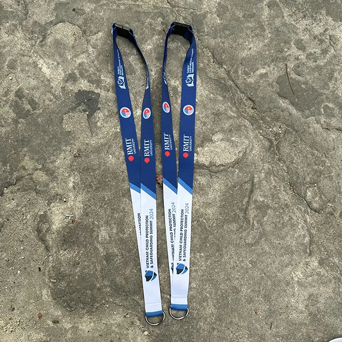 Lanyard vải satin phối màu xanh – trắng, in logo RMIT sắc nét, mang đến sự đồng bộ và chuyên nghiệp cho tập thể.