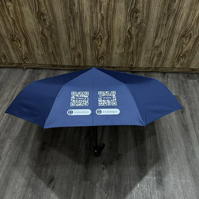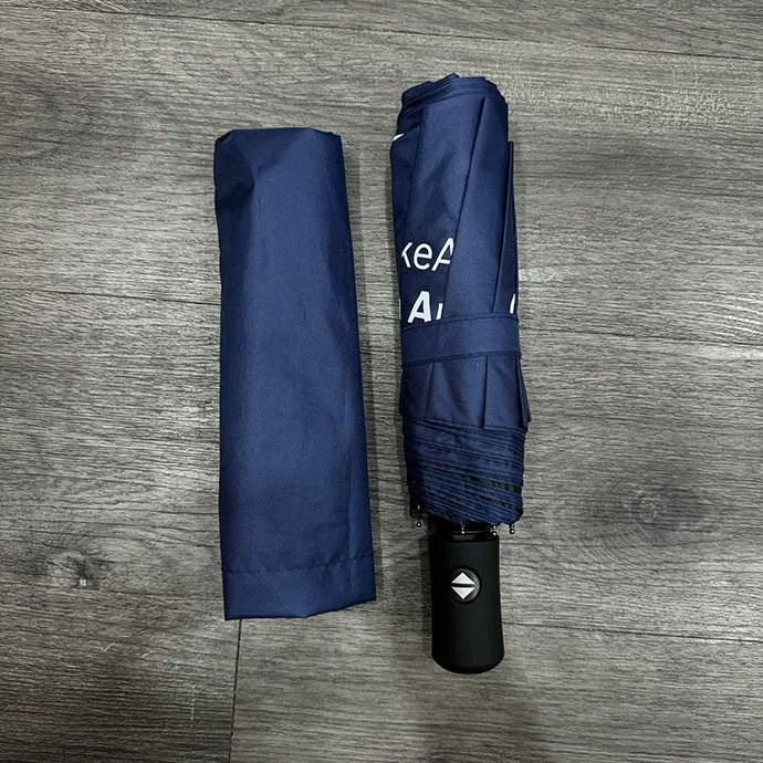 Ô dù gấp gọn màu xanh navy, tay cầm nhựa đen chắc chắn, in logo thương hiệu nổi bật. Tiện dụng khi di chuyển, thích hợp làm quà tặng khách hàng, nhân viên, sự kiện.