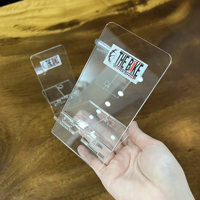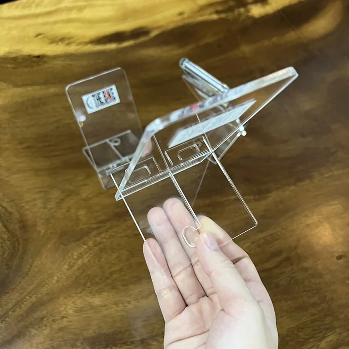 Giá đỡ điện thoại mica gấp gọn in logo là phụ kiện tiện lợi giúp cố định điện thoại khi làm việc, đọc sách, xem video hoặc sử dụng tại quán café. Thiết kế gấp gọn, chất liệu mica trong suốt, phù hợp làm quà tặng quảng bá thương hiệu và quà tặng sự kiện.