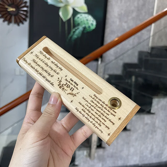 Hộp đựng bút bằng gỗ khắc logo theo yêu cầu là lựa chọn quà tặng tinh tế, sang trọng và bền đẹp. Thiết kế hộp gỗ chắc chắn, bề mặt vân gỗ tự nhiên, có thể khắc laser logo/tên/ thông điệp để tăng nhận diện thương hiệu. Phù hợp làm quà tặng doanh nghiệp, quà tri ân và quà sự kiện cao cấp.