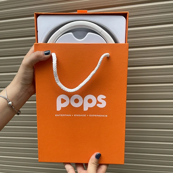 Hộp quà giấy cao cấp dạng túi xách màu cam in logo Pops thiết kế hiện đại, nổi bật, phù hợp làm quà tặng thương hiệu, truyền thông sự kiện và quà lưu niệm doanh nghiệp.