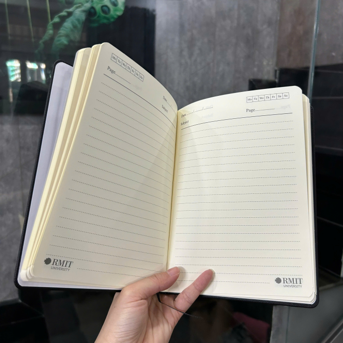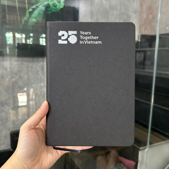 Sổ tay da PU cao cấp: trang giấy dày mịn, thiết kế sang trọng, phù hợp cho ghi chú công việc hoặc họp hành.