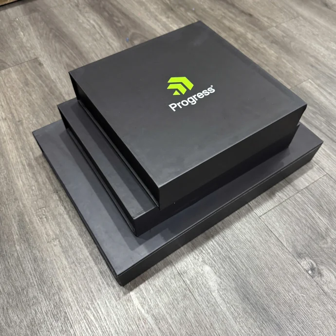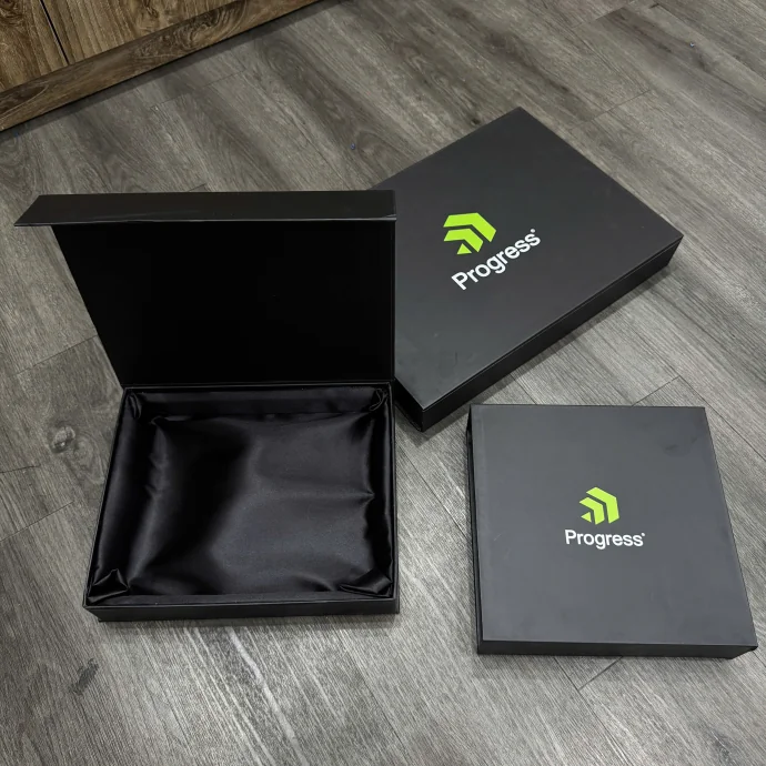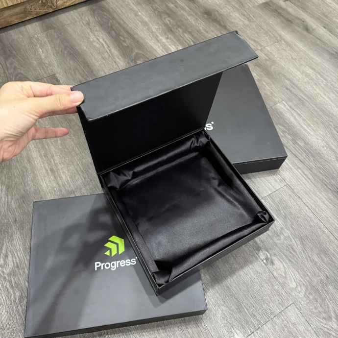 Hộp quà tặng cao cấp màu đen, thiết kế nắp nam châm, lót vải satin, in logo thương hiệu theo yêu cầu, phù hợp cho quà VIP, quà tri ân khách hàng.