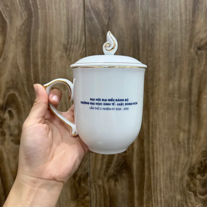 - Công nghệ in: In lụa, in UV hoặc ép kim vàng/đồng trên ly, ô hoặc hộp