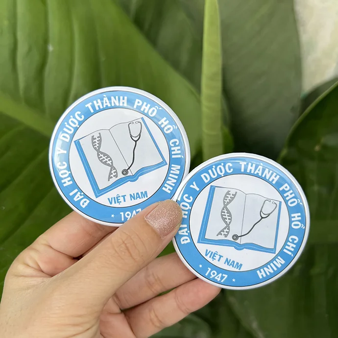 Huy hiệu kèm đế là lựa chọn quà tặng vừa “đúng tính nhận diện” vừa tiện sử dụng: có thể cài áo khi tham dự sự kiện, và có thể đặt trưng bày trên bàn làm việc/tủ kính sau chương trình. Mẫu logo Đại học Y Dược TP.HCM dạng tròn, viền xanh, chữ rõ nét – rất hợp làm huy hiệu đồng phục, huy hiệu hội nghị, huy hiệu kỷ niệm khóa.