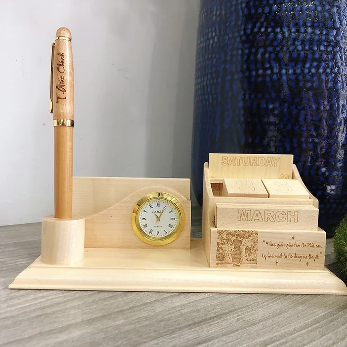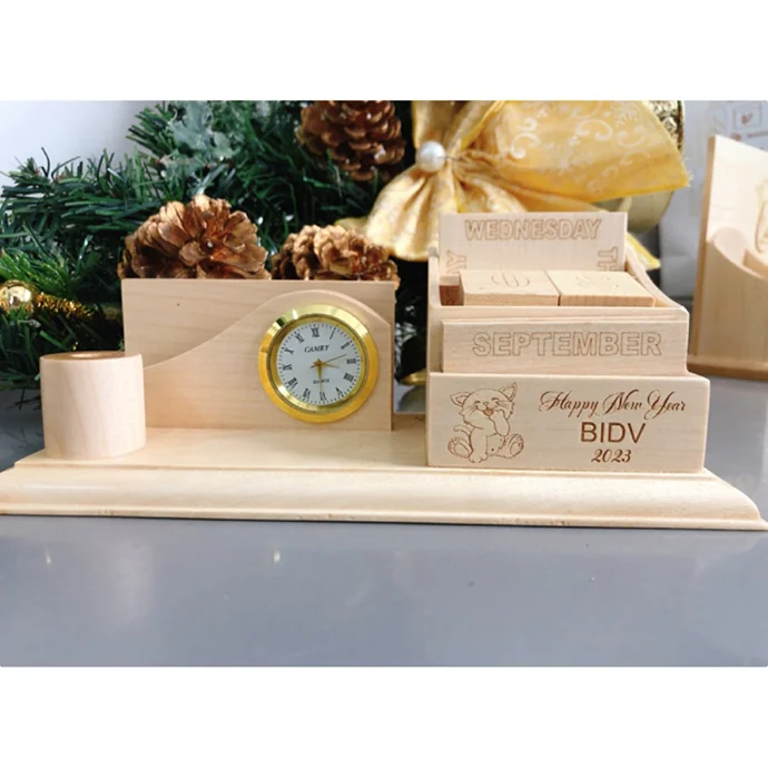 Lọ đựng bút bằng gỗ để bàn thiết kế đơn giản nhưng sang trọng, tích hợp đồng hồ và lịch gỗ tiện dụng, phù hợp làm quà tặng doanh nghiệp, quà tri ân đối tác với dịch vụ khắc logo theo yêu cầu.