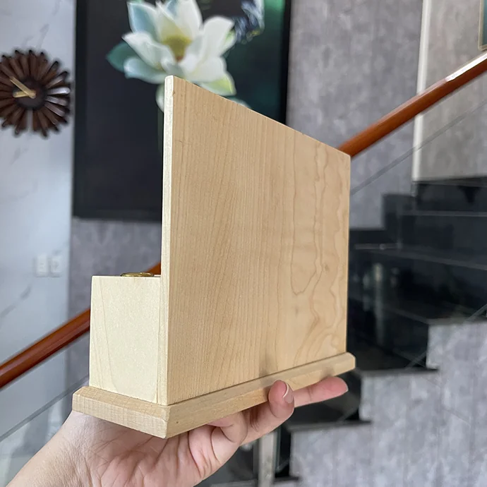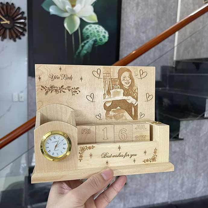 Sản phẩm được thiết kế từ gỗ tự nhiên với kiểu dáng tối giản nhưng tinh tế, kết hợp đồng hồ kim loại gắn liền khay bút, giúp không gian làm việc trở nên gọn gàng và sang trọng hơn.