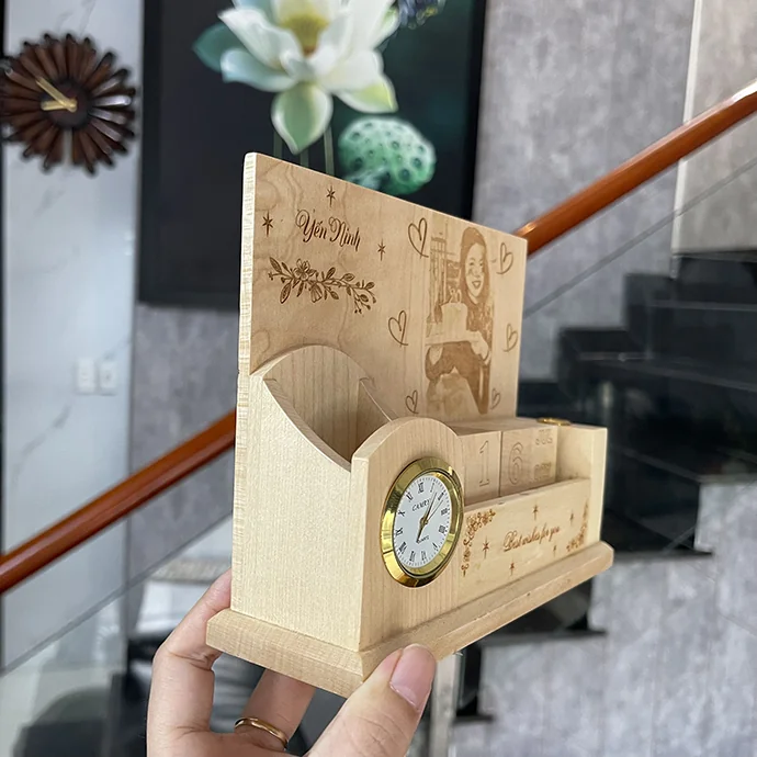Khay đựng bút gỗ có đồng hồ phù hợp dùng cho bàn làm việc cá nhân, phòng giám đốc, phòng họp hoặc làm quà tặng doanh nghiệp, quà tri ân khách hàng, quà vinh danh. Hỗ trợ khắc logo, khắc nội dung theo yêu cầu trực tiếp lên sản phẩm.