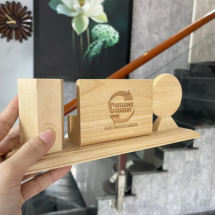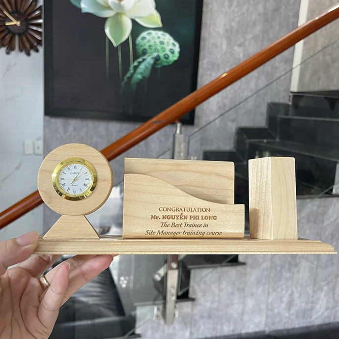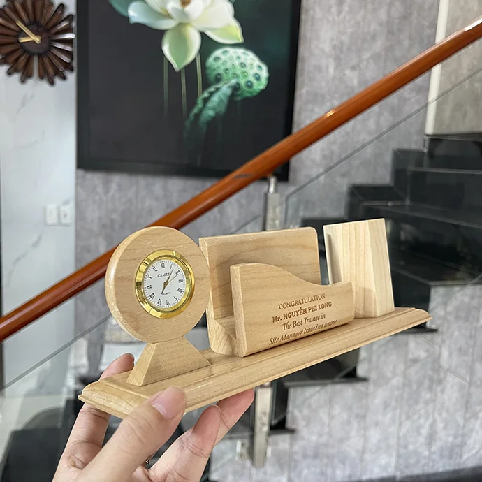 Bộ khay đựng bút gỗ kèm đồng hồ phù hợp làm quà tặng doanh nghiệp, quà tri ân khách hàng, quà hội nghị, sự kiện cuối năm. Hỗ trợ khắc logo, khắc tên đơn vị, khắc thông điệp theo yêu cầu, đảm bảo tính cá nhân hóa và nhận diện thương hiệu.