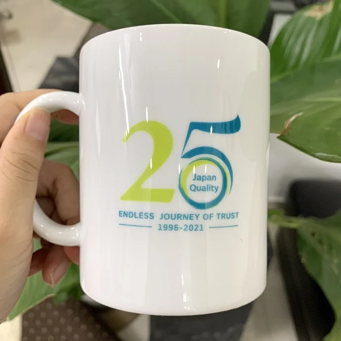 Ly sứ in chuyển nhiệt logo kết hợp thông điệp kỉ niệm 25 năm