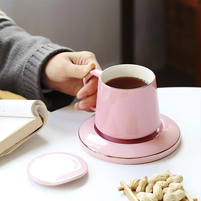 Ly sứ có độ dày vừa phải giúp giữ nhiệt tốt cho cà phê, trà hoặc các loại đồ uống nóng. Dĩa lót đồng màu tạo tổng thể hài hòa, thìa kim loại mạ màu sang trọng, nâng tầm trải nghiệm sử dụng.