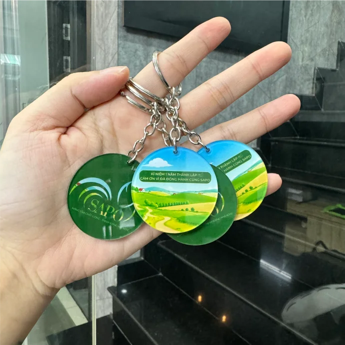 Móc khóa mica in logo theo yêu cầu, thiết kế đa dạng, in UV sắc nét, độ bền cao, phù hợp làm quà tặng doanh nghiệp, sự kiện và chiến dịch quảng bá thương hiệu.