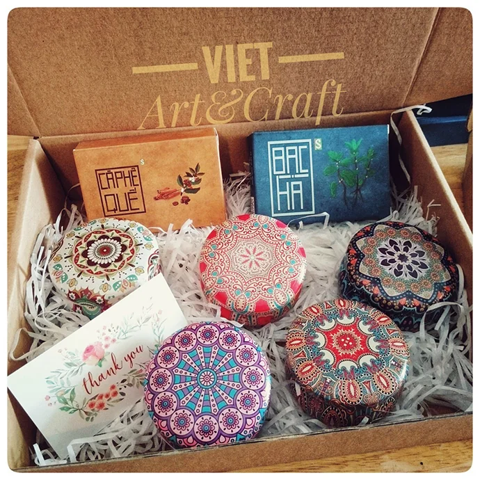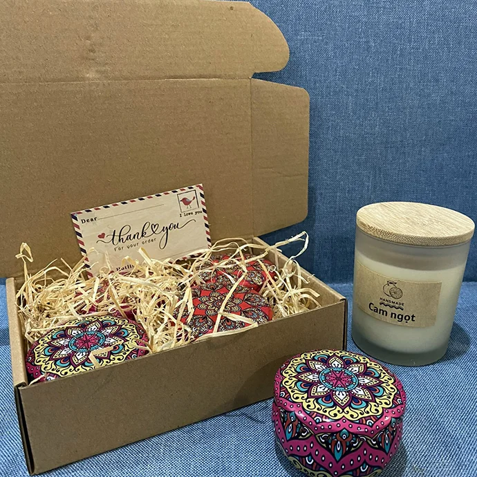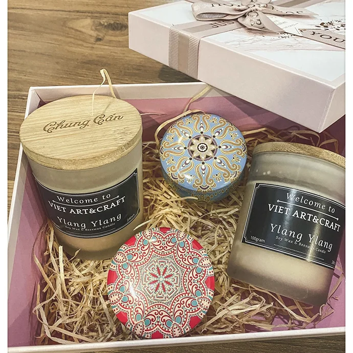 Nến được đổ thủ công với hộp đựng trang trí hoa văn tinh xảo, phù hợp nhiều phong cách quà tặng từ tối giản đến cao cấp.