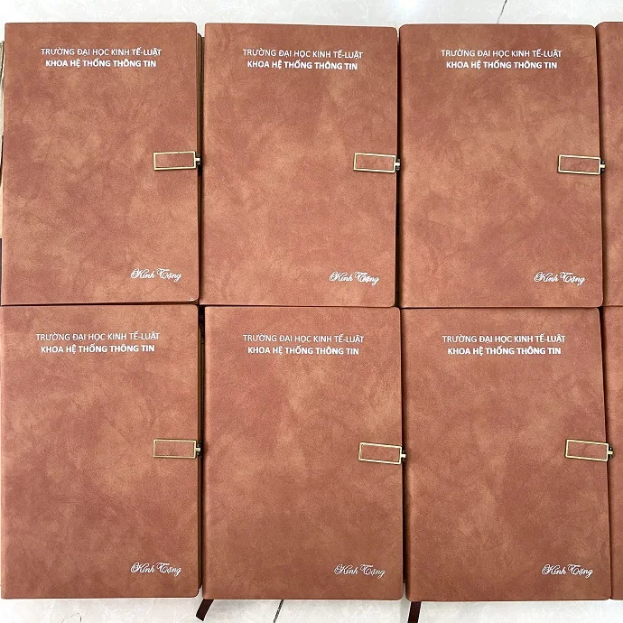 Mẫu sổ tay bìa da màu nâu khóa cài kim loại mang phong cách trang nhã, phù hợp với môi trường công sở, học đường và các chương trình đào tạo. Màu nâu da bò kết hợp với chi tiết kim loại tạo nên vẻ ngoài sang trọng, lịch sự và hiện đại.