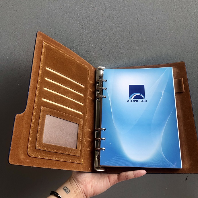 Mẫu sổ tay sở hữu gam màu xanh dương hiện đại kết hợp viền nâu ấm, mang lại sự hài hòa và chuyên nghiệp. Thiết kế cắt cạnh độc đáo giúp sản phẩm nổi bật hơn so với các mẫu sổ thông thường.