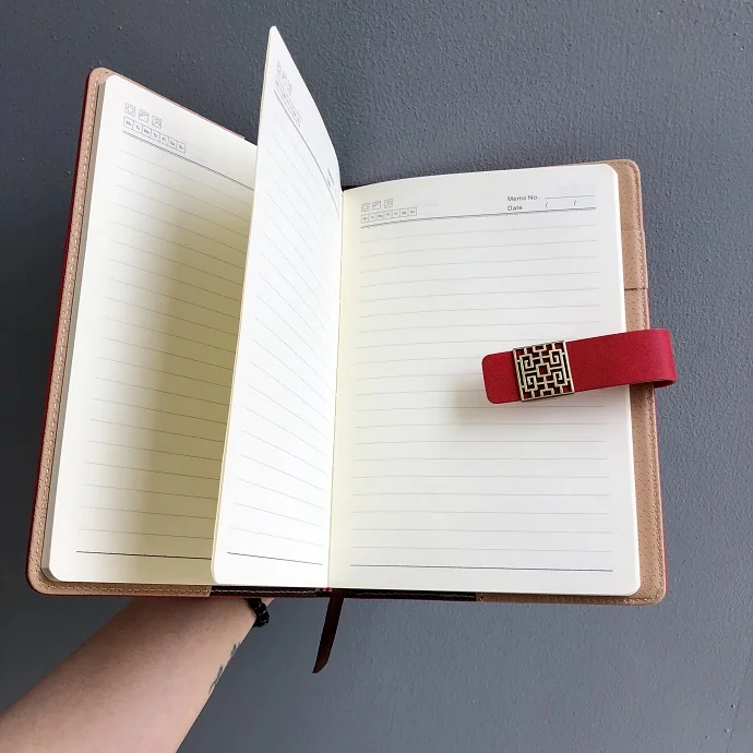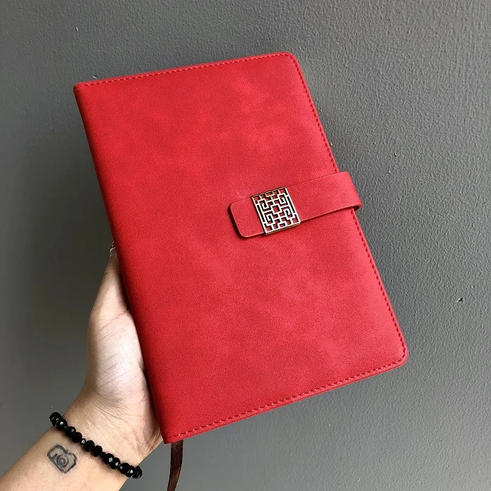 Sổ tay bìa da đỏ nổi bật với khóa kim loại hoa văn thanh lịch, mang phong cách hiện đại, phù hợp sử dụng trong công việc và đời sống hằng ngày.
