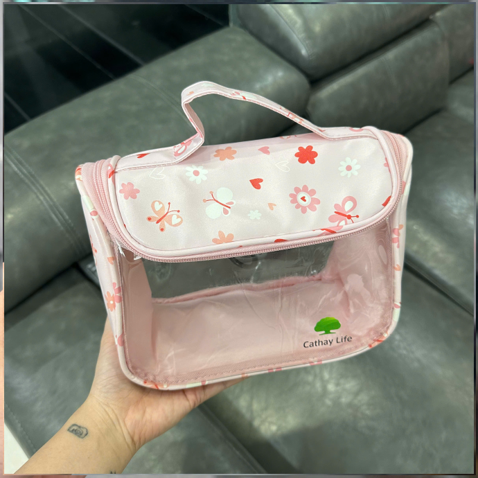 Túi đựng mỹ phẩm trong suốt in logo Cathay Life – thiết kế dễ thương, tiện lợi và phù hợp làm quà tặng sự kiện, hội nghị hoặc chương trình tri ân khách hàng.