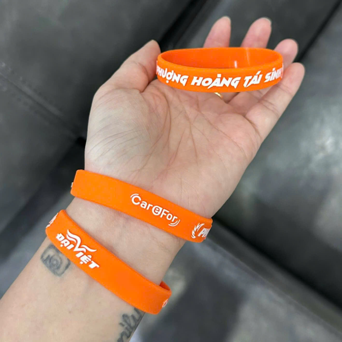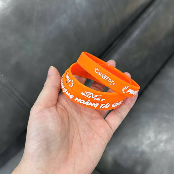 Vòng tay cao su màu cam nổi bật, thiết kế bền đẹp, mềm dẻo, in logo theo yêu cầu, phù hợp làm quà tặng sự kiện, chương trình truyền thông, teambuilding hoặc cổ động thương hiệu.
