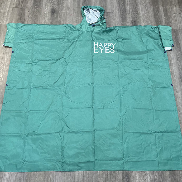 Áo mưa doanh nghiệp HAPPY EYES là mẫu áo mưa quảng cáo màu xanh lá được thiết kế riêng cho thương hiệu dược phẩm. Sản phẩm sử dụng chất liệu vải dù chống thấm cao cấp, có dải phản quang an toàn, giúp thương hiệu nổi bật ngay cả trong điều kiện mưa gió. Logo “HAPPY EYES” được in sắc nét ở giữa áo, thể hiện tinh thần tự nhiên, tươi mới và thân thiện với người dùng.