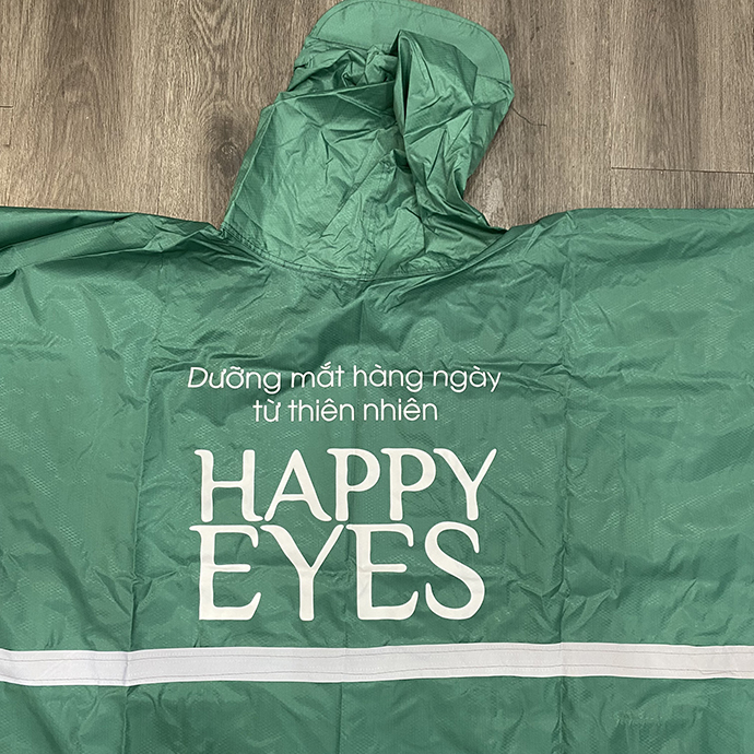 Áo mưa doanh nghiệp HAPPY EYES được sản xuất theo tiêu chuẩn quà tặng quảng cáo chuyên nghiệp. Với thiết kế gọn nhẹ, gam màu xanh lá thân thiện và thông điệp “Dưỡng mắt hằng ngày từ thiên nhiên”, sản phẩm thể hiện rõ nét giá trị thương hiệu trong ngành dược phẩm và chăm sóc sức khỏe.