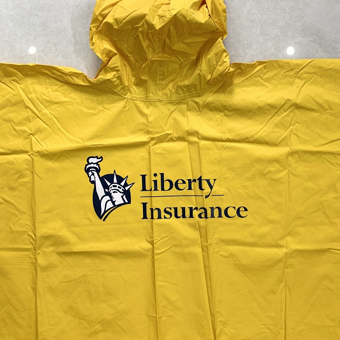 Áo mưa cánh dơi màu vàng in logo Liberty Insurance có thiết kế rộng rãi, dễ mặc, khả năng chống nước tốt và màu sắc nổi bật. Sản phẩm phù hợp làm quà tặng doanh nghiệp, quà khuyến mãi mùa mưa và các chương trình truyền thông thương hiệu.