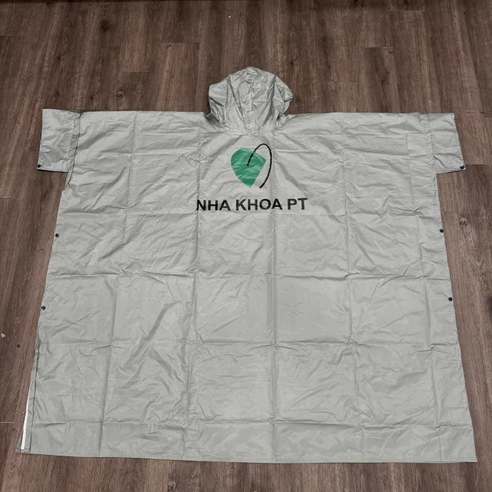 Áo mưa poncho màu xám in logo NHA KHOA PT. Thiết kế rộng, có mũ trùm đầu, dễ mặc và tiện lợi cho người dùng. Sản phẩm vừa bảo vệ sức khỏe, vừa giúp quảng bá thương hiệu hiệu quả.